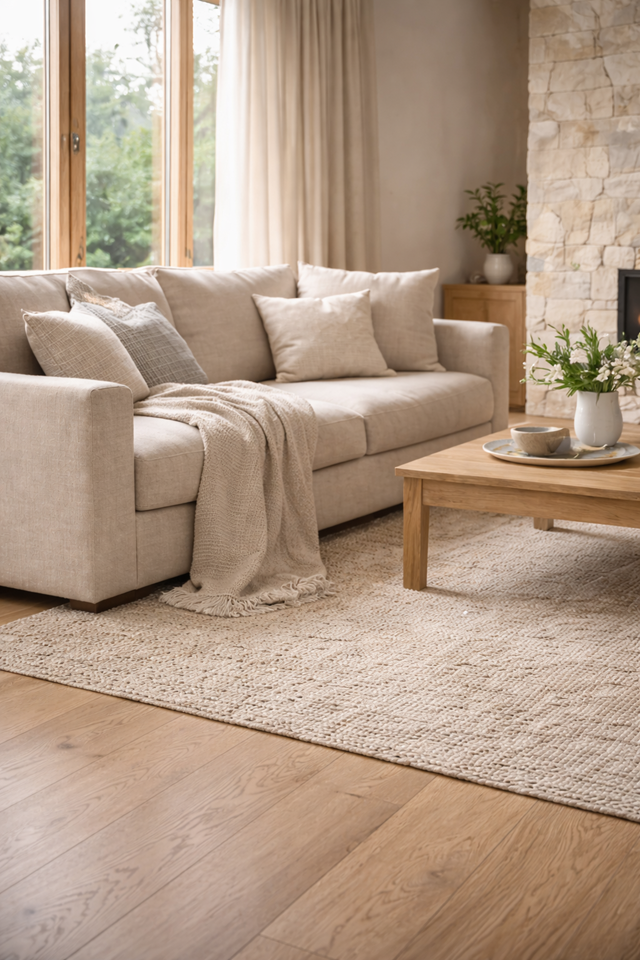 Olohuoneessa puu, kivi ja luonnonkuidut toimivat yhdessä luoden tasapainoisen ja viihtyisän kokonaisuuden. Puulattia, villamatto ja kivinen tehosteseinä voivat muodostaa harmonisen ja kerroksellisen tilan. Näiden materiaalien yhdistely tuo visuaalista syvyyttä ilman, että tila tuntuu raskaalta.